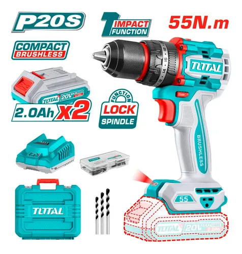 TALADRO PERCUTOR INDUSTRIAL MOTOR BRUSHLESS 20 VOL – MANDRIL METALICO 13 MM – TORQUE DE 55 NM – CON MALETIN CARGADOR Y 2 BATERIAS 2 AMP